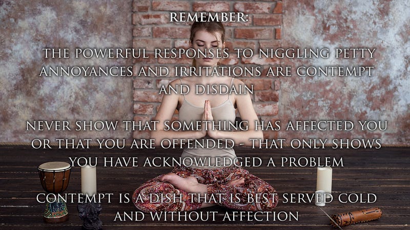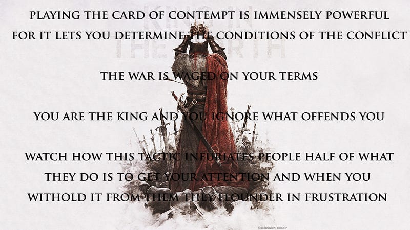 “You must play the card of contempt with care and delicacy. Most small troubles will vanish on their own if you leave them be; but some ill grow and fester unless you attend to them. Ignore a person of inferior stature and the next time you look he has become a serious rival, and your contempt has made him vengeful as well”.
